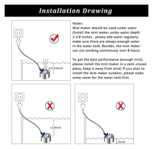 【WATERDICHTE ONTWERP MIST MAKER】 Waterdichte ontwerp Ultrasone Fogger, u hoeft zich geen zorgen te maken dat het zou afbreken als gevolg van weken in het water voor een lange tijd. Uitgerust met 94.48in (2,4 m) lange adapterkabel, het is volledig lang genoeg voor het maken van mist voor binnen- of buitenfonteinen, aquarium, waterfunctie of gebruik van kantoorruimte.