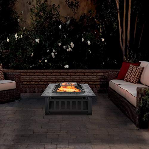 Vuurschaal met grillrooster, vuurschaal met vonkbescherming, Fire Pit voor BBQ, verwarming, tuin, terras, metalen vuurkorf, 3-in-1 open haard in de open lucht, vierkante vuurplaats