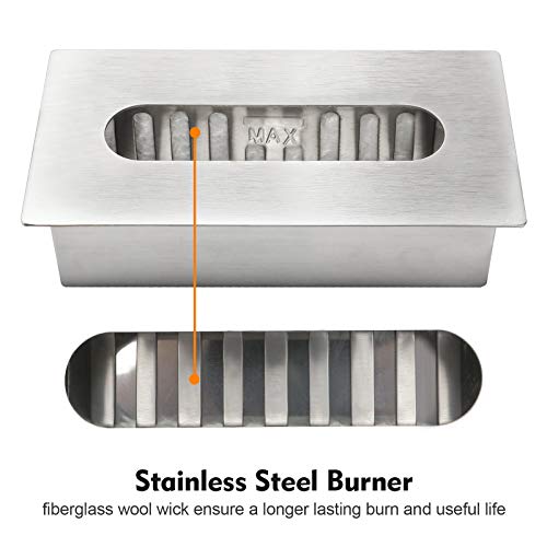 – Stevige roestvrijstalen basis herbergt de 2 branders met glasvezel wollen lont voor ultieme duurzaamheid.