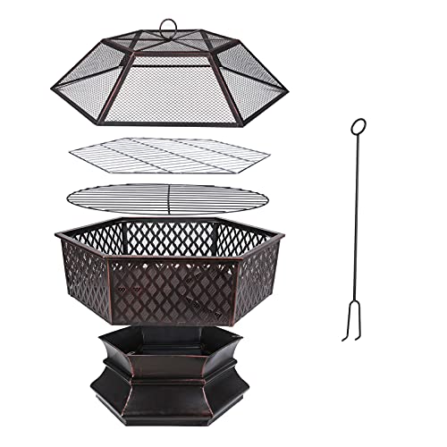 Vuurschaal met vonkbescherming, zeshoekige vuurplaats tuin, vuurkorf met grillrooster, pookhaak en grillrooster, voor…